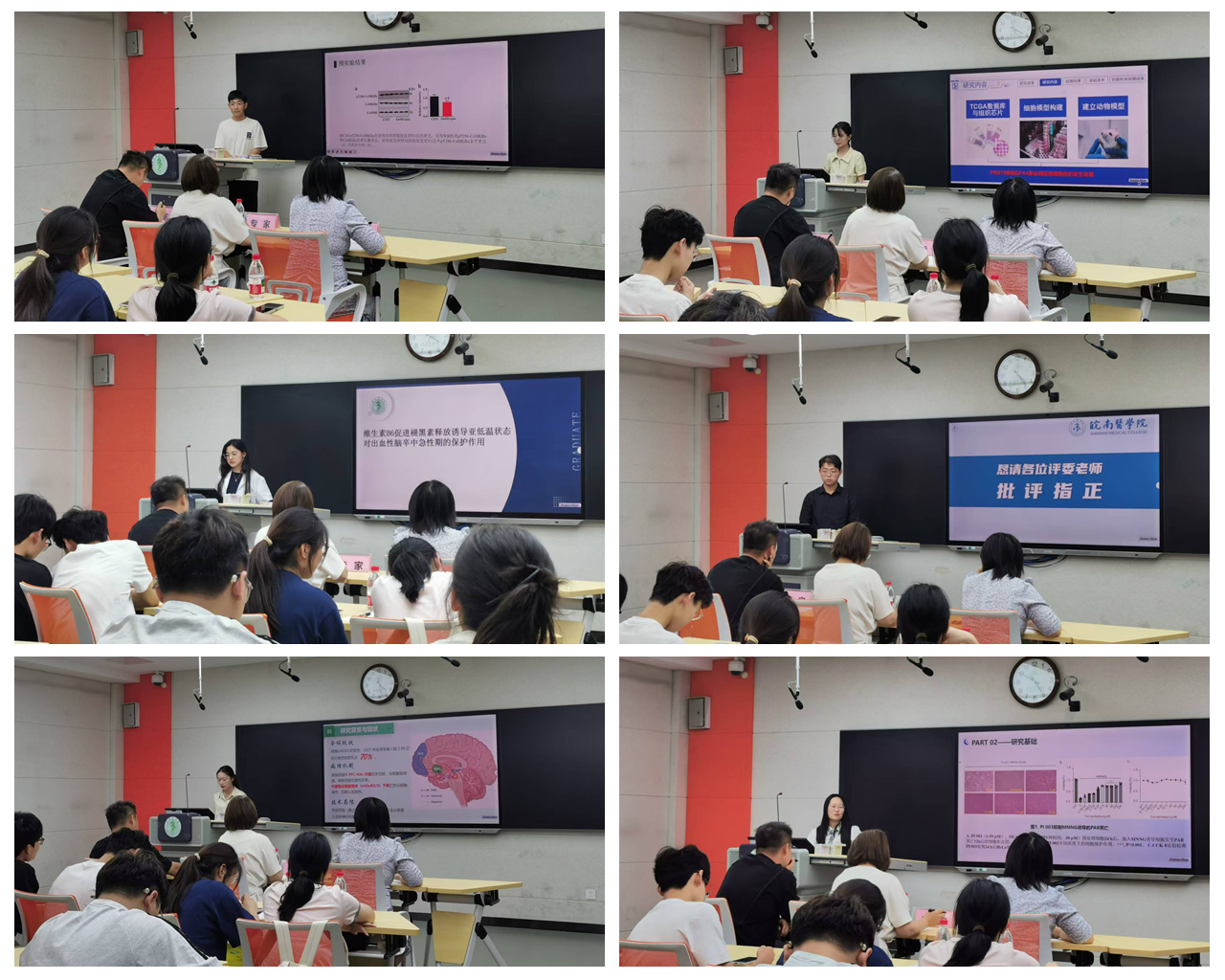 本次院赛涵盖创新训练、创业训练和创业实践三类项目,分为一般项目和重点支持项目两类。其中,重点支持项目聚焦科技前沿、经济主战场等关键领域,鼓励新工科、新医科等跨学科交叉研究。答辩现场,各项目团队负责人通过现场抽签确定答辩顺序,通过PPT展示项目背景、创新点、研究计划等内容。汇报结束后,各评委聚焦项目核心要素,围绕评分标准中的创新性、可行性及预期成果现场提出疑问,并为项目执行提供建议。最后,王林在总结中强调,创新创业训练不仅是一次项目申报,更是将理论知识转化为实践能力的重要契机;希望同学们以此次院赛为起点,在跨学科协作中开拓思维,在科研实践中锤炼本领,为推动医学创新与社会发展贡献青春力量。