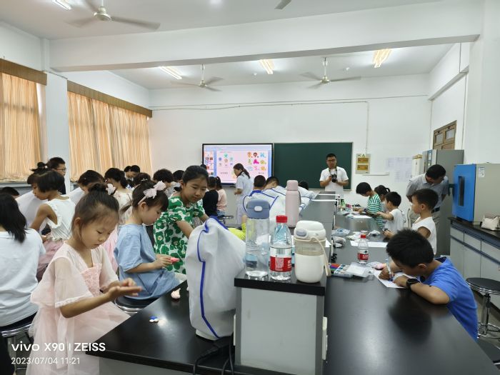 上午10:00,教研室迎来了20多位5岁到10岁的小朋友。董博翰为小朋友们带来了主题为《保护人体的免疫小卫士》的科普讲座,边讲解边互动,深入浅出地向大家介绍了免疫小卫士——免疫细胞是如何打败微生物从而保护人体健康的。讲座结束后,微免支部的党员志愿者和蒲公英免疫双科小组的同学们一起指导、帮助小朋友们观察了光学显微镜下各种形态的免疫细胞和细菌。整个活动过程中,小朋友们兴致勃勃,热情高涨,并用彩泥制作了形态各异的免疫细胞,用彩笔绘制了免疫小卫士大战微生物的图画,激发出小朋友丰富的想象力和科学热情。活动在师生们的默契配合、小朋友们的欢声笑语中圆满结束。