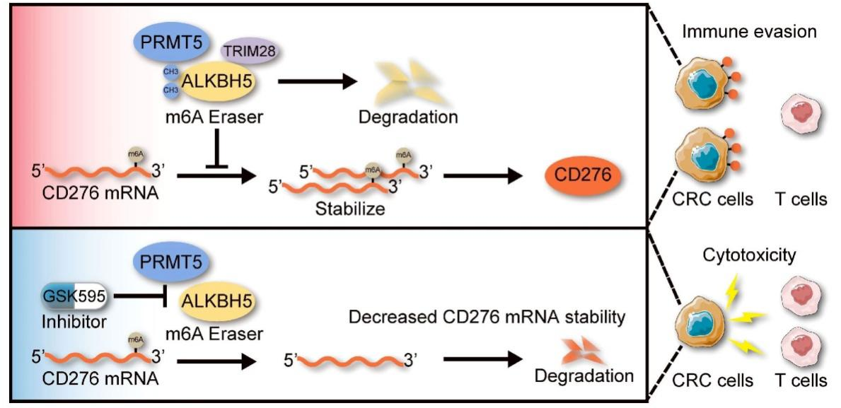 PRMT5是精氨酸甲基转移酶家族蛋白的重要成员之一,已有报道表明PRMT5能促进多种肿瘤的免疫逃逸作用,但PRMT5调控肿瘤免疫逃逸作用机制并不明确。该研究首先发现PRMT5能通过调控结直肠癌细胞的m6A修饰来增强结直肠癌的免疫逃逸作用。团队成员运用meRIP-Seq、RNA-Seq、质谱检测等分析方法,发现PRMT5催化m6A去甲基酶ALKBH5的R316位点发生对称性二甲基化修饰(meR316-ALKBH5),meR316-ALKBH5进一步被TRIM28泛素化降解,这导致ALKBH5对CD276转录本的m6A去甲基化作用减弱,从而引起CD276的m6A修饰增加并提升它的mRNA稳定性,最终导致免疫检查点蛋白CD276表达增多并促进结直肠肿瘤免疫逃逸。相关研究结果该团队在2024年11月以BB贝博艾弗森为申请人已向国家知识产权局申报国家发明专利。
