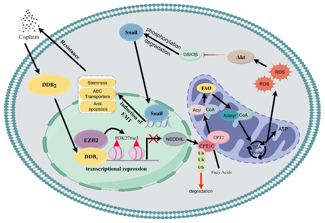 肺癌是全球癌症相关死亡最常见的原因之一。铂类化疗是非小细胞肺癌(NSCLC) 患者的主要治疗选择,但化疗的有效性往往会受到耐药性的阻碍。因此,了解化疗耐药的分子机制对于改善治疗效果和预后都至关重要。为此,精准医学北斗科研小组成员在吴志浩研究员的带领下,通过采用细胞活力测定和细胞凋亡分析化疗耐药性,以及Western blot 分析和划痕试验用于评估上皮-间充质转化过程(EMT)、免疫沉淀用于分析蛋白质修饰过程等一系列实验,确定了 EMT 标志物和肉碱棕榈酰转移酶 1C (CPT1C) 的表达模式。因而,我们明确了CPT1C 在肺癌中高表达,且与 NSCLC 细胞中的顺铂耐药有关。CPT1C 敲降增加了 NSCLC 细胞对顺铂的敏感性,而 CPT1C 的过表达增加了 NSCLC 细胞对顺铂的耐药性。此外,CPT1C 在翻译后水平受到调节,E3-泛素连接酶 NEDD4L 被我们团队证明是 CPT1C 稳定性和活性的主要调节因子。这些结果首次提供了脂质代谢酶 CPT1C 介导化疗耐药性的有效证据,为 CPT1C 抑制剂的联合肺癌治疗提供了一种有前景的新途径。