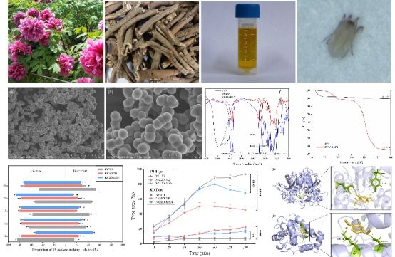 粉尘螨是引起人类皮炎、鼻炎、哮喘等过敏性疾病的重要过敏原;安徽道地药材凤丹皮是牡丹皮中的上品,具有抑菌、杀虫、抗炎等多种功效;植物源性绿色杀螨剂具有广谱、低毒、安全等优点,已成为害螨防治的重点研究方向。赵金红教授团队基于安徽道地药材凤丹皮,通过纳米包封技术,制备出形态和性状均稳定的纳米乳和纳米颗粒,相较纯挥发油对粉尘螨具有更好的接触、熏蒸和驱避作用,提高了凤丹皮挥发油的稳定性,具有缓慢释放和持续杀螨活性。与粉尘螨体内AChE的结合位点为Tyr-111和Glu-279,与SOD的结合位点为Lys-140和Ser-144。