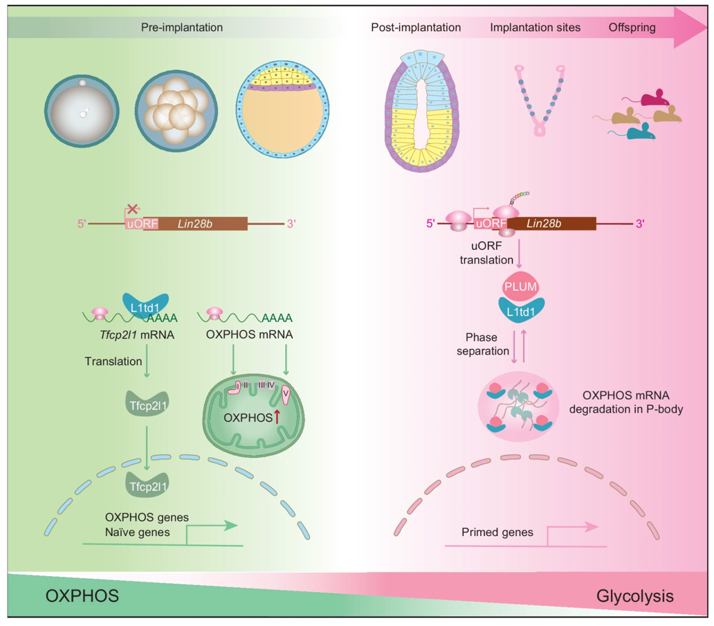 机制探索中,团队进行了时间序列的转录组分析,发现PLUM敲除改变了Naïve多能性基因表达的模式,加速了Naïve基因更均一的表达。值得注意的是,PLUM敲除使线粒体呼吸链复合物相关基因表达在转变早期骤然升高,表明线粒体代谢在其中起关键作用。进一步研究发现PLUM与RNA结合蛋白L1td1直接互作。L1td1在胞质中通过相分离形成点状凝聚体,而PLUM敲除会破坏这一结构,使L1td1聚集完全消失,并彻底改变其在多能性 Primed-Naïve 转换中的功能。接下来,团队利用eCLIP-seq分析发现PLUM敲除改变了L1td1结合的下游靶标,使L1td1特异结合Naïve多能性基因Tfcp2l1和Zfp42的mRNA,从而提高了它们的RNA稳定性。而Tfcp2l1可直接结合并激活Naïve和线粒体呼吸链复合物基因的表达。另一方面,PLUM敲除也破坏了细胞中负责 mRNA 降解的P颗粒,提示PLUM可能通过P颗粒组装调控线粒体呼吸功能。结合基因敲除小鼠及胚胎移植实验,研究团队发现PLUM的缺失会引发线粒体异常活化,最终导致胚胎着床率显著下降。
