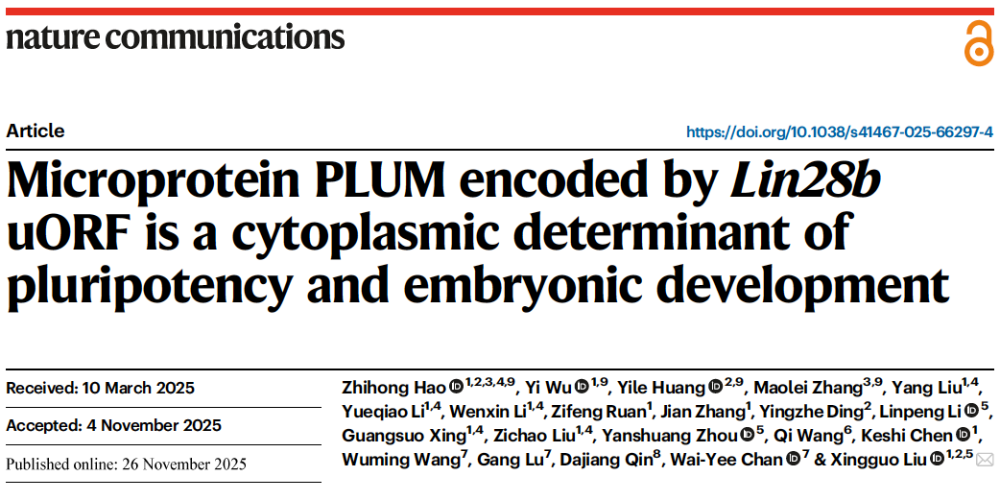 近日,公司特聘教授刘兴国老师团队在Nature Communications(IF=15.7,Nature子刊)上发表了题为《Microprotein PLUM encoded by Lin28b uORF is a cytoplasmic determinant of pluripotency and embryonic development》的研究论文,揭示了多能干细胞中首个由非经典阅读框编码的功能蛋白PLUM,在亚细胞水平连接无膜细胞器的RNA调控与线粒体代谢的翻译重塑,在多能性与胚胎发育中发挥关键的决定性作用。BB贝博艾弗森广州生物医药与健康研究所、BB贝博艾弗森香港科技创新研究院再生医学与健康研究中心、天府金城实验室前沿医学中心、BB贝博艾弗森等为本研究的共同作者单位,公司特聘教授刘兴国为本研究的唯一通讯作者,BB贝博艾弗森青年博士王琪作为文章署名作者参与该项研究工作。