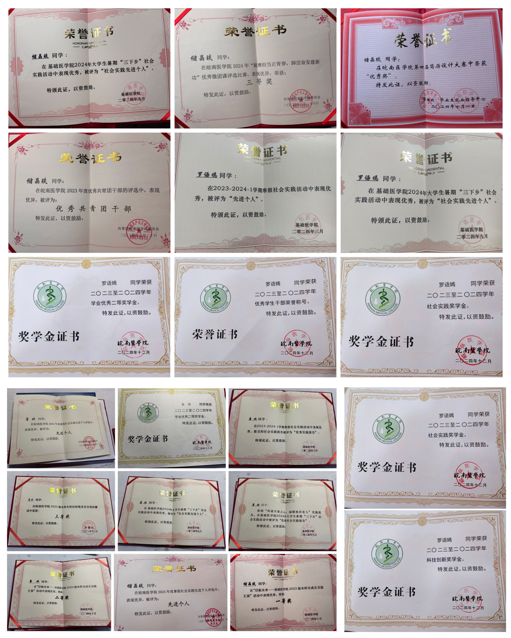 宿舍三人均为共青团员,且均递交了入党申请书,两人已是入党积极分子身份。课余时间,三人积极参与各类社会实践活动,发挥专业特长,为社会普及健康知识,用实际行动践行青春担当,展现了新时代青年的责任与风采。在2024年老员工暑期“三下乡”社会实践中,两人被评为校级先进个人,一人获2023-2024学年校级社会实践奖学金。