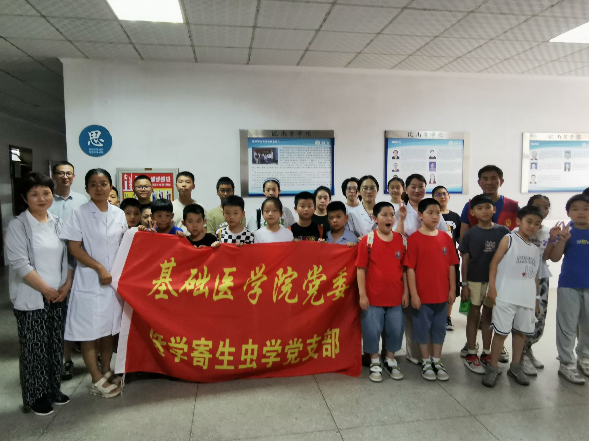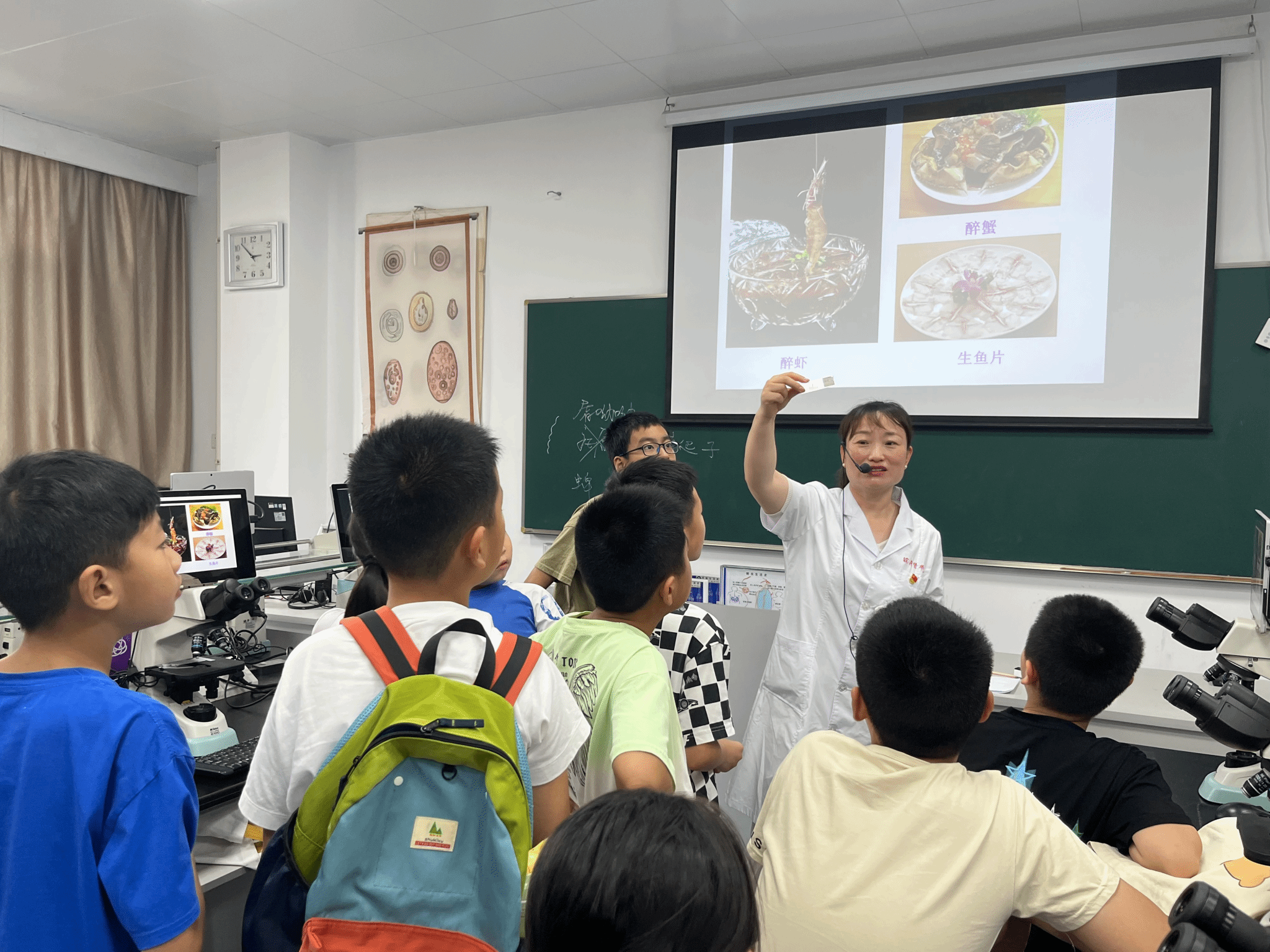 活动的第一站,小朋友们来到BB贝博艾弗森滨江校区(北区)2号实验楼,医学寄生虫学教研室谷生丽老师形象生动地向社区孩子们介绍了一些常见种类的医学蠕虫,如蛔虫、血吸虫、蛲虫等食源性寄生虫,以及与我们生活密切相关的医学节肢动物,如蚊、蝇、蜱、隐翅虫等,现场观察了寄生虫的大体标本和活体标本,强调了生活中如何防治这些经口感染和经皮肤感染的寄生虫病的一些实用方法。