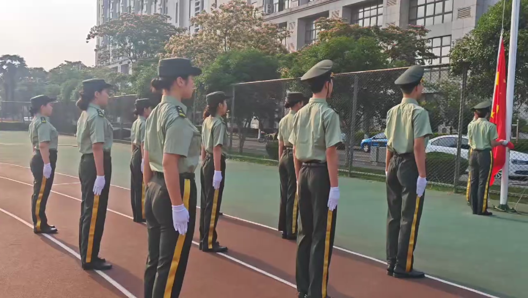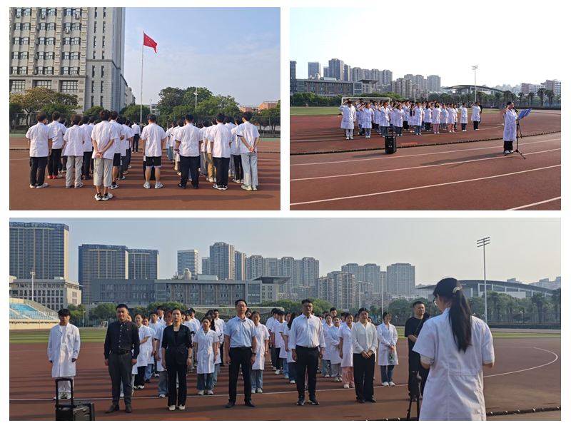 7时15分,校国旗护卫队迈着整齐划一的步伐护送国旗入场。在全体师生肃穆的注目中,五星红旗伴随国歌冉冉升起,激昂的旋律回荡在田径场上空。“国旗是国家的象征,凝聚着亿万人民的信仰。”主持人的话语点燃了现场师生的爱国热情,所有人脱帽行注目礼,用歌声传递对祖国的深切热爱。这一刻,朝阳与国旗交相辉映,青春与信仰同频共振。 “医学从不是孤立的学科,它与国家的命运、人民的健康紧密相连。”优秀员工代表、2024级基础医学1班组织委员蔡怡雯同学以《医心向党》为主题,在国旗下分享了医员工的家国担当。她以基层医疗体系发展、中国援外医疗队等案例为切入点,号召同学们夯实专业根基、锻炼实践能力、涵养家国情怀。“从解剖学的每一根骨骼到病理学的每一个细胞,都关乎生命奥秘”,她强调医员工需以严谨态度钻研知识,更要在社区义诊、急救普及中践行“有时治愈,常常帮助,总是安慰”的医者仁心。