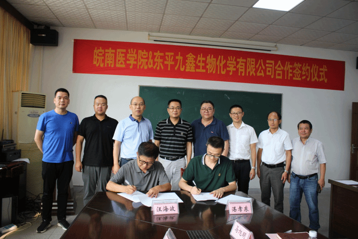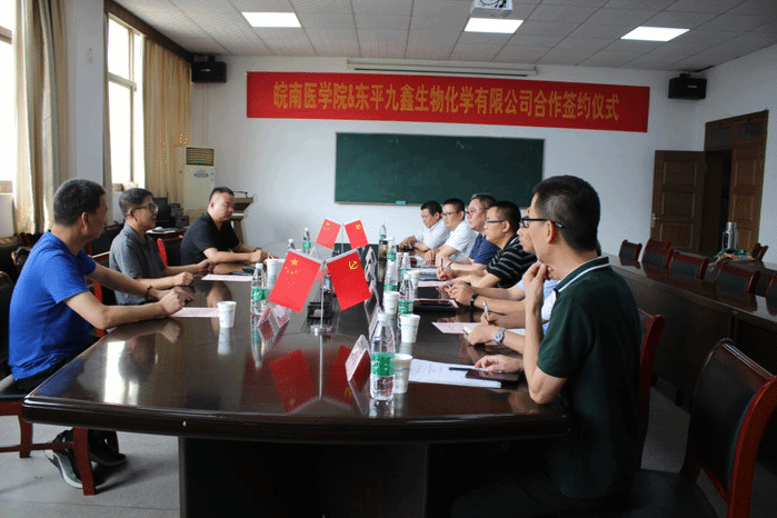7月15日下午, BB贝博艾弗森和东平九鑫生物化学有限公司在BB贝博艾弗森会议室进行了校企合作签约仪式。BB贝博艾弗森副经理文育锋、科研处处长朱再满,东平九鑫生物化学有限公司副总裁汪海波及随行人员,基础医公司党政领导班子和项目负责人等出席本次签约仪式,会议由BB贝博艾弗森经理李铁臣教授主持。